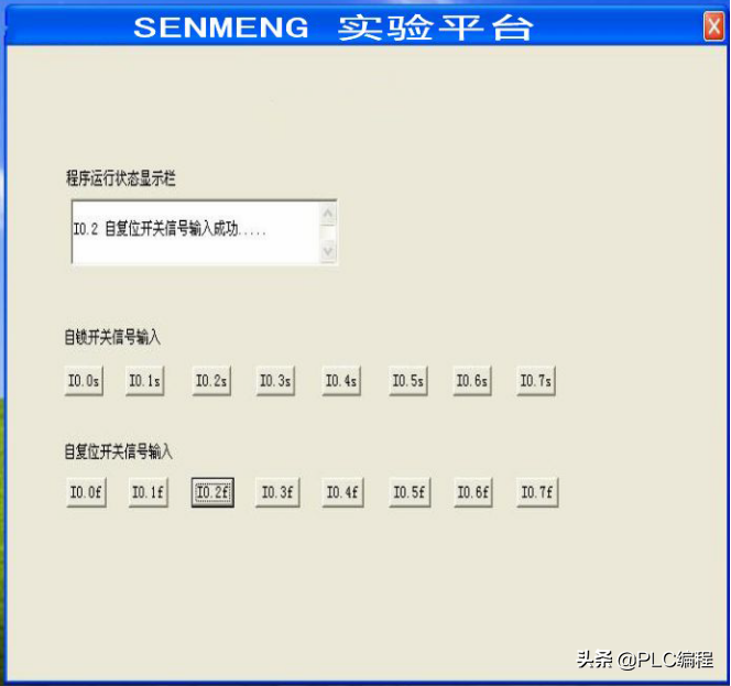 当按下SB2即i0.0(鼠标点击i0.0f)接通后,Q0.0接通,小车右行(即指示 灯 Q0.0 亮)。当小车运行碰到右限位开关SQ2即i0.4(用鼠标点击i0.4f,模拟SQ2被压下)接通,此时小车左行(指示灯Q0.0灭,指示灯Q0.1亮),当运行到左边碰到左限位SQ1即i0.3(鼠标点击i0.3f)接通,此时小车又往右运行(指示灯Q0.1灭,指示灯Q0.0 亮)。如此往返运动下去直到按下SB1即i0.2(鼠标点i0.2f)接通,小车停止运行。