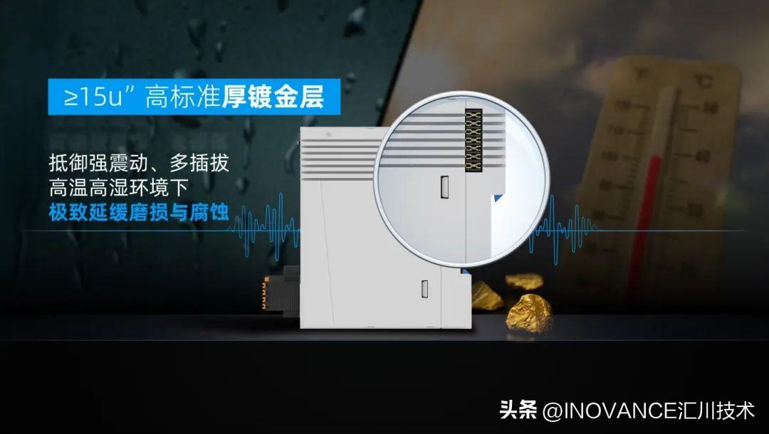 你一定想不到,汇川这款通用型PLC-AM760,是按照适应风机运行工况的标准设计的!从选材用料的角度来看,即便最容易被忽视的连接器,汇川都一律采用15u"以上的高标准厚镀金层,以极致延缓设备在强震动、多插拔和易氧化环境中的磨损与腐蚀,如食品包装、瓦楞纸产线等高温高湿工况,进一步确保控制器长效稳定运行。