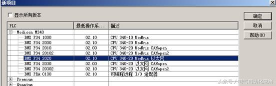 在菜单栏“文件”中选择“新建”,弹出下图,选择你需要的CPU如BMX P34 2020 (02.00),然后确定,点击菜单“文件另存为”,取文件名My Projiet-1:保存。即完成了项目建设与工程名字修改工作。