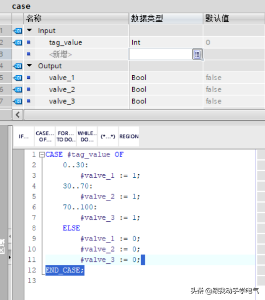 注:通过本示例,主要是跟大家看看case语句的使用,同时,也是通过本示例来看看使用结构文本ST编程的多种方法。
