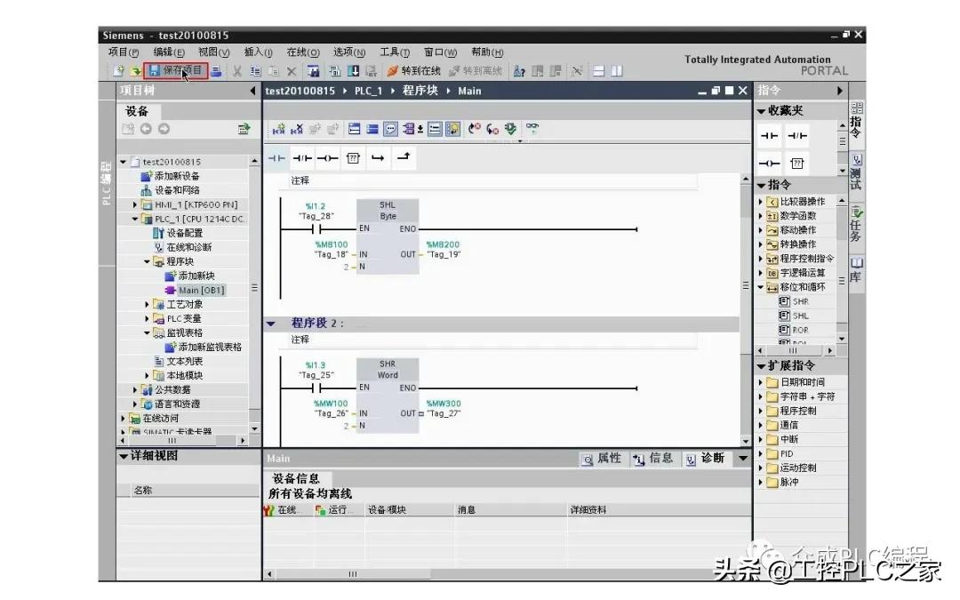 一、编写程序。在项目视图中打开OB1,在指令树中拖拽左移位指令到程序段1中,选择数据类型为字节,在移位指令的使能端插入常开触点I1.2,输入IN参数MB100,输入N参数2,输入OUT参数为MB200。在指令树中拖拽右移位指令到程序段2,选择数据类型为字,在移位指令的使能端插入常开触点I1.3,输入IN参数MW100,输入N参数2,输出参数OUT为MW300。这样一个简单的移位指令的实例就完成了,单击保存项目按钮保存项目。