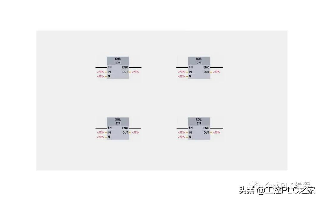 移位指令 。移位指令用于将参数IN的位序列移位,结果送给参数OUT,参数N指定移位的位数。单击移位名称下方可以选择数据类型,移位指令IN和OUT端支持的数据类型为字节BYTE、字WORD、双字DWORD。移位时用0填充移位操作清空的位。