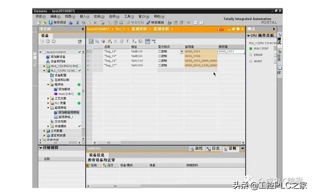 三、查看程序运行情况。单击“转到在线”按钮,在项目树中单击打开监视表格文件夹,双击添加新监视表格,可以看到项目树中添加了监视表格,同时在工作区打开了监视表格编辑器,输入地址MB100和MB200、MW100和MW300,显示格式为二进制,单击监视按钮观察程序的运行情况,在监视表格中修改MB100为01011,按下I1.2可以看到MB200的值变为MB100的值左移2位的结果,按下I1.3可以看到MW300的值变为MW100的值右移2位的结果。