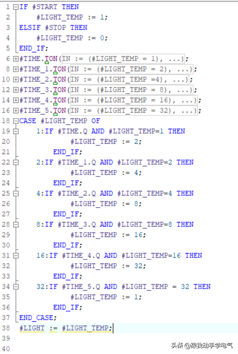 1、使用条件语句IF,当按下启动按钮来对灯赋值1(点亮第一盏灯),当按下停止按钮,则对灯赋值0(熄灭所有灯)