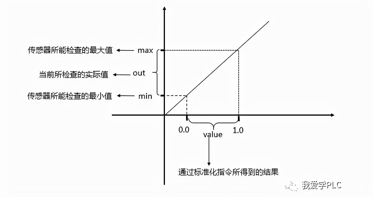 “标准化”指令,通过将输入 VALUE 中变量的值映射到线性标尺对其进行标准化。 可以使用参数 MIN 和 MAX 定义范围的限值。 输出 OUT 中的结果经过计算并存储为浮点数,这取决于要标准化的值在该值范围中的位置。 如果要标准化的值等于输入 MIN 中的值,则输出 OUT 将返回值“0.0”。 如果要标准化的值等于输入 MAX 的值,则输出 OUT 需返回值“1.0”。如果是用于模拟量的转换,则MIN和MAX表示的就是我们模拟量模块输入信号对应的数字量的范围,而VALUE表示的就是我们的模拟量模块的采用值。如下图所示: