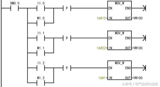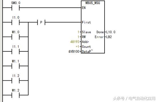 下面程序是通过按钮(I0.0—I0.2)控制变频器正转,反转和停机。修改变频器运转命令,M1.0正转,M1.1反转,M1.2,向变频器2000h单元值写入1是停止,12是正转,22是反转,1是停机。