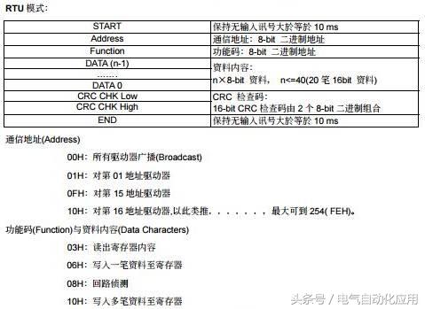 通讯协议:台达变频器支持Modbus RTU模式和ASCII码模式,我们用RTU模式,通讯协议如下图:例如要查询地址是01的2102H的数据,需要发送0103210200028FF7,返回01030417700000FE5CH,其中01是地址,03是查询命令,417700000F是返回的数据8FF7是校验码。如果要向变频器写数据需要发送06命令,例如发送0106010017708622,向01号变频器的0100地址写数据1770,如果操作成功,返回0106010017708622。