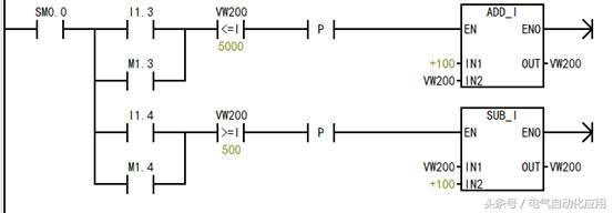 下面程序是按下加速按钮(I0.3)vw200单元数值增加100,按下减速按钮(I0.4)VW200单元数值减100.