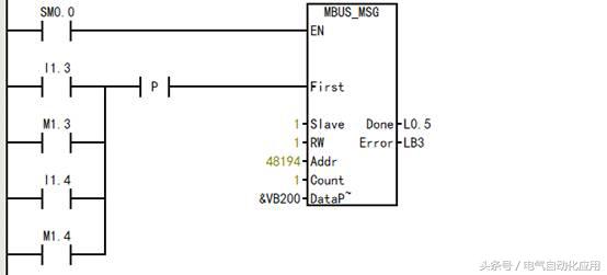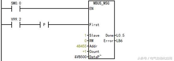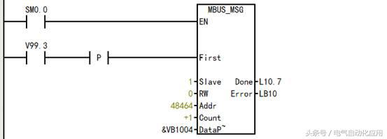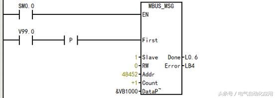 以下为读变频器参数,读变频器2103H是获取输出频率,读2104H是获取输出电流,2106h输出电压,2103h=8451,8451+40001=48452是向2103H读数据,即读频率值,读出的频率值送变量存储器VB1000单元中。