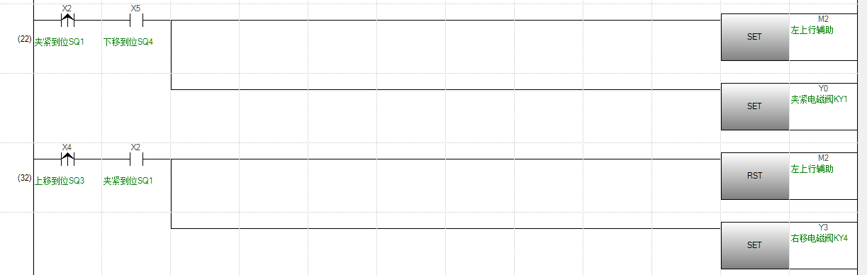 当机械手下降到下限位时,与 Y0 线圈串联的 X16 动断触点断开, Y0 线圈失电,机械手停止下降。此时, M11 、X16 均为 ON,其动合触点接通,再按下起动按钮 X6 时, M2 又变为 ON,M12 得电并自保持,机械手进入夹紧状态,同时 M11 也变为OFF。在完成某一步的动作后,必须按一次起动按钮,系统才能进入下一步。