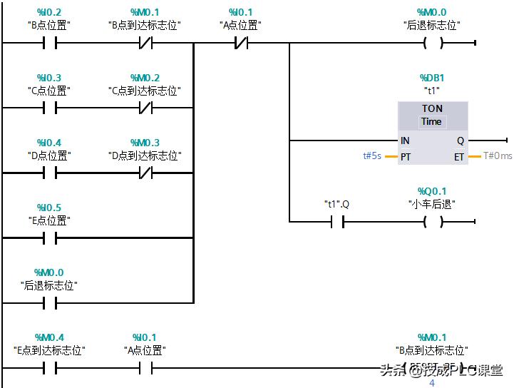1、在这个案例中主要使用的是常开、常闭、线圈、定时器指令。案例中有5个工位,当按下启动按钮后,小车启动。到达B、C、D、E任何一点都需要停止小车前进(使用M0.0标志位断开小车前进),然后再延时,延时时间到达后后退。