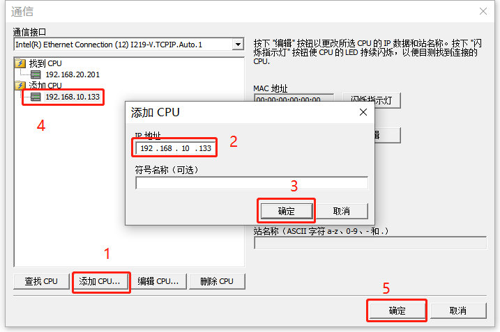 通讯接口选择网卡名称+.TCPIP.AUTO.1的驱动,然后添加CPU输入192.168.10.133的CPU,如图17所示。