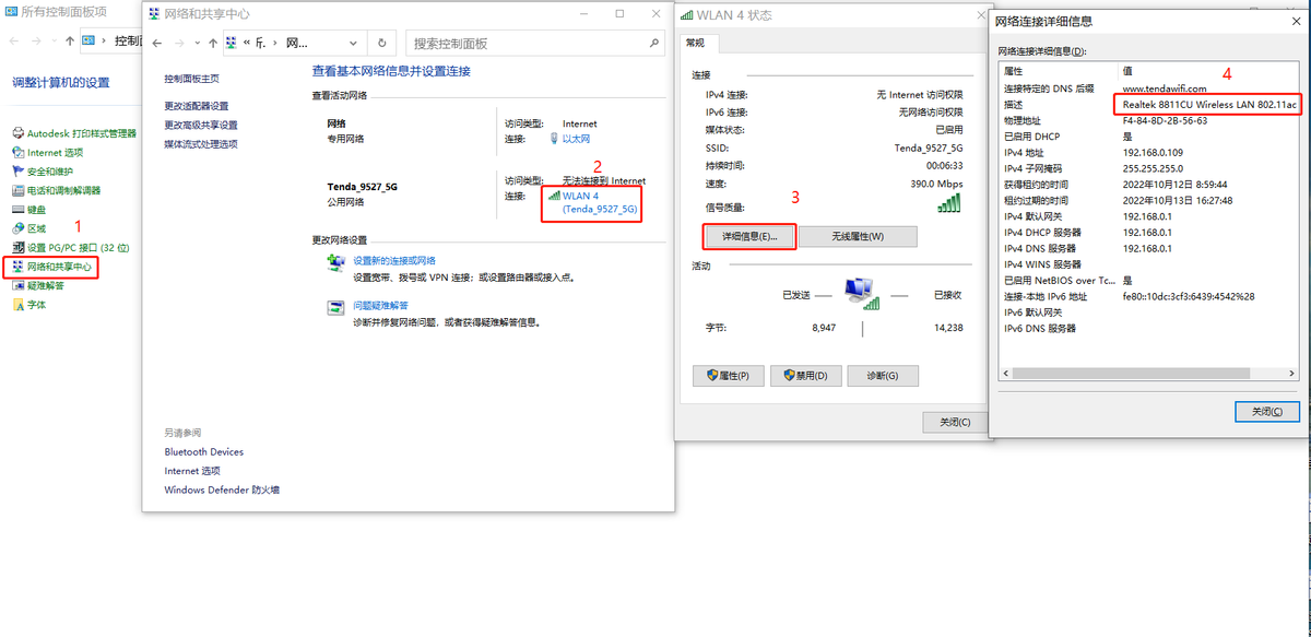 在控制面板中找到网络和共享中心;点击WLAN,进入WALN状态窗口界面;点击详细信息进入网络连接详细信息窗口界面;在描述中可以看到WIFI网卡驱动名称。图3