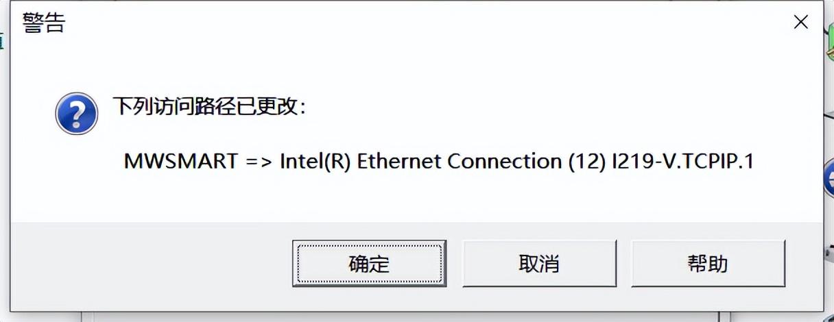在控制面板中找到设置PG/PC接口(32位),应用程序访问点中选择MWSMART,使用的接口分配参数(P)中选择以太网网卡名称+.TCPIP.AUTO.1的驱动,如图10所示。当更改访问接口后点击确定,会弹出警告提示窗口,如图11所示,选择是即可。