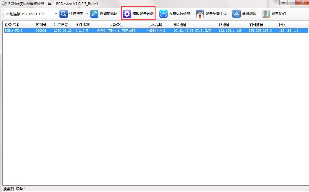 1. 打开 BCDevice,搜索到 BCNet-FX-S 后,选择【修改设备参数】