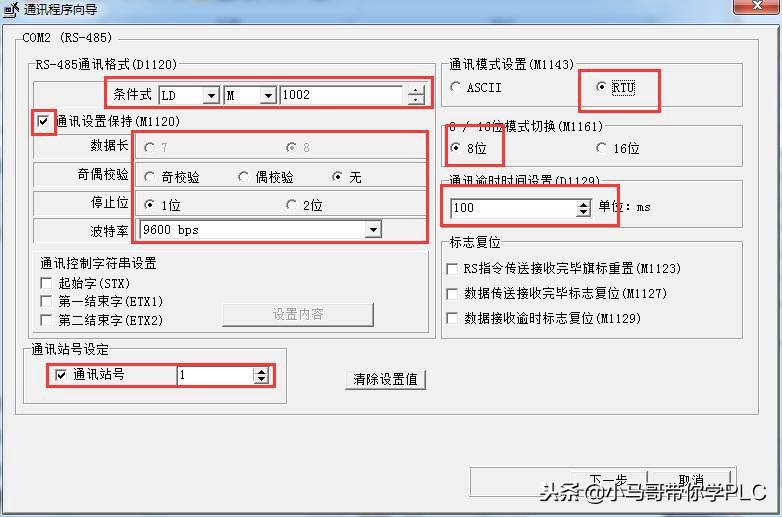 进入COM口参数选择界面,(某些型号会让您选择设定的是CMO1/2/3,选择自己要连接DTU的PLC串口即可),如下图,设置通讯参数为 9600,8,N,1;并且保持通讯参数,通讯模式为RTU,通讯等待延迟为100ms,通讯站号是设定PLC作为第几子站,此图中设定为1。点击下一步,选择支持MODBUS指令,之后一直点击下一步到完成。