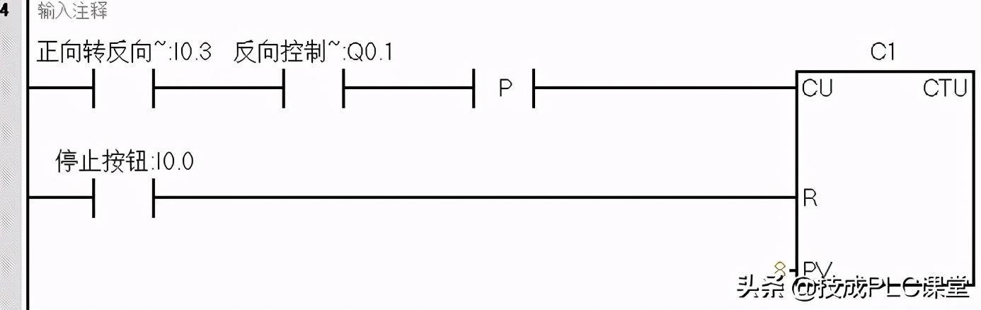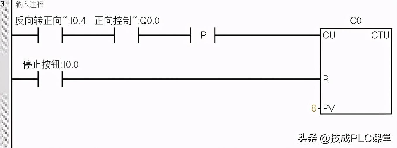 按下启动按钮SB1,I0.1触点闭合,Q0.0 线圈输出,控制KM1线圈得电,即行车执行前进操作,Q.0.0的常开触点闭合,形成自锁。强制I0.3为1,则Q0.0线圈失电,Q0.1 线圈得电,控制KM2线圈得电,即行车执行后退操作,Q0.1的常开触点闭合,形成自锁,同时C1计数1次。I0.3强制为0,I0.4强制为1,则Q0.1线圈失电,Q0.0线圈得电,控制KM1线圈得电,即行车执行前进操作,Q0. 0的常开触点闭合,形成自锁,同时C0计数1次。