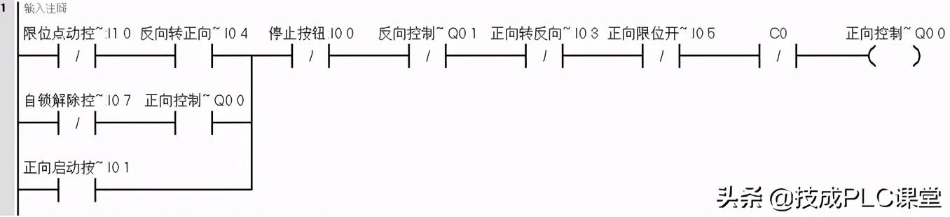 2、小车后退到达A点位置后,小车又继续前进。假定前一次到达的位置是B点,则这一次需要到达的是C点位置。到达C点位置就会触碰到B点的限位开关,故使用标志位(M0.1)断开小车在B点前进功能。