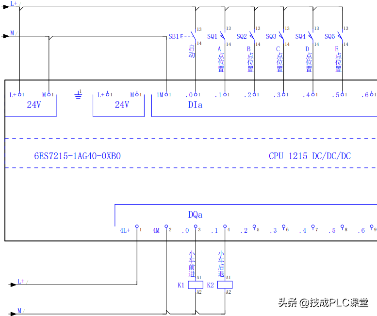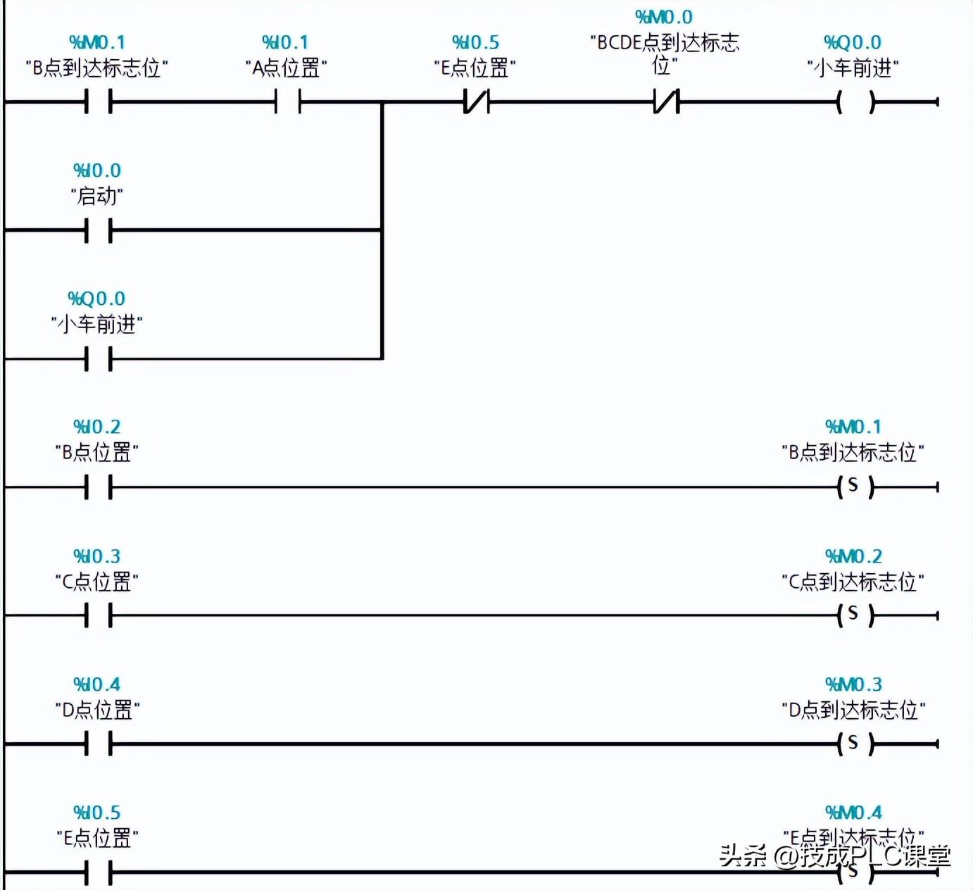 1、在这个案例中主要使用的是常开、常闭、线圈、定时器指令。案例中有5个工位,当按下启动按钮后,小车启动。到达B、C、D、E任何一点都需要停止小车前进(使用M0.0标志位断开小车前进),然后再延时,延时时间到达后后退。