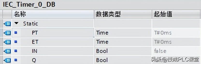 在项目树的“程序块”中可以看到自动生成的IEC_Timer_0_DB[DB1]数据块(见图2-2-4)双击进入,即可读取DB1定时器的各个数据,变量的数据类型为IEC_Timer,见表2-2-5。