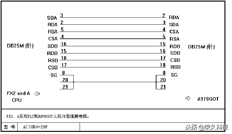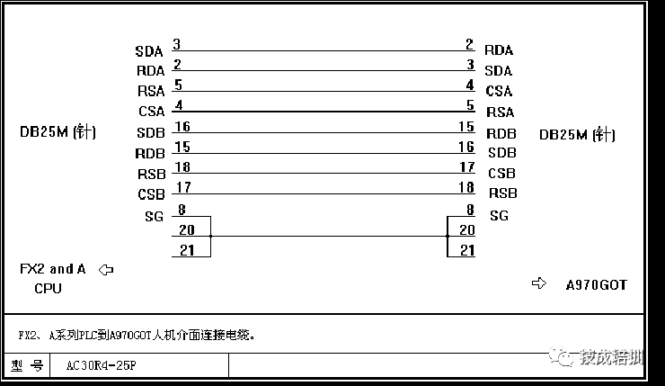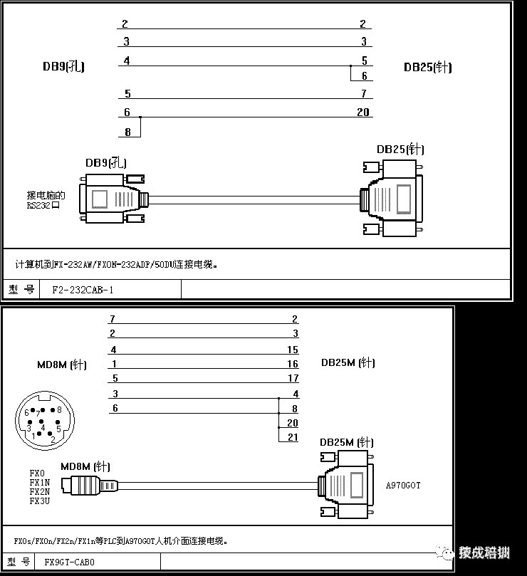 FX2、A系列PLC到A970G0T人机界面连接电缆