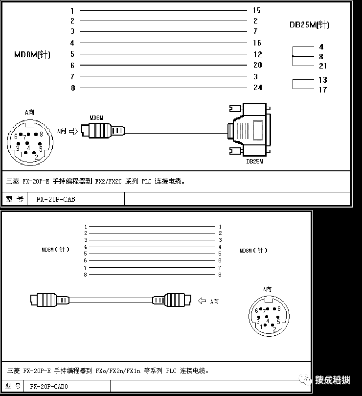 三菱FX-20P-E手持编程器到FX2/FX2C系列PLC连接电缆