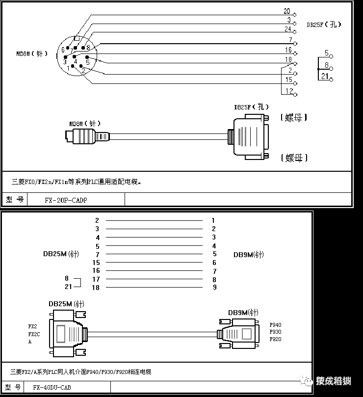 三菱FX2/A系列PLC同人机介面F940/F930/F920相连电缆。