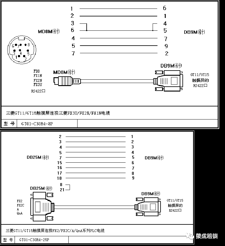 三菱GT11、GT15触摸屏连接FX2、FX2C、A、QnA系列PLC电缆