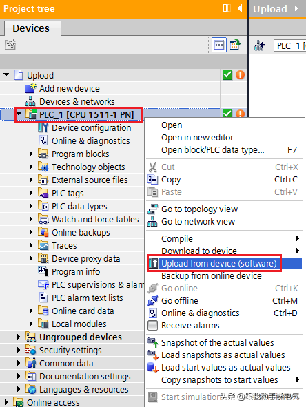 7.当在线连接建立后,在项目树中该站点上点击右键, 在下拉框中选择"Upload from device (software)" 。