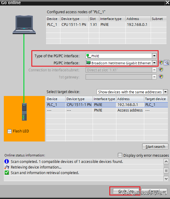 6.系统将检查该兼容设备的可访问性。这可能需要花费一些时间,设备被确认后 "Select target device:" 窗口就会显示出其IP地址,点击“GoOnline”按钮建立在线连