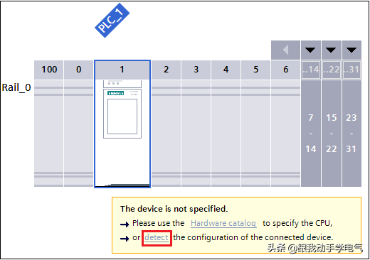 新建一个Step7项目,用 "Add new device" 功能添加一个CPU模块,在本例中添加一个 "unspecified CPU 1500",模块的订货号为6ES75XX-XXXXX-XXXX。 注意: 组态时不需要考虑 "unspecified CPU 1500"的在线及离线的固件版本。模块在组态中未具体定义,可以在CPU下面的窗口中看到相关信息,之后点击“detect”按钮图. 1