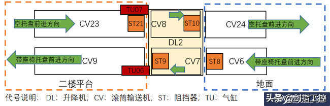 我们以SE设备中的一台升降机(编号DL2)来详细介绍SFC编程的思路。如下图是DL2的平面布局,DL2双侧带CV滚筒输送机。DL2在下降位(地面)时CV7搬入CV6里带座椅的托盘,CV8搬出空托盘至CV24内;DL2在上升位(二楼平台)时CV7搬出带座椅的托盘至CV9内,CV8搬入CV23里的空托盘;TU06和TU07的作用是DL2在上升位时,机械气缸锁定住DL2,防止DL2抱闸等故障突然下坠。