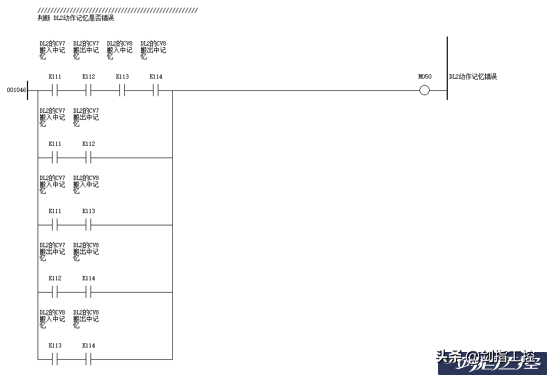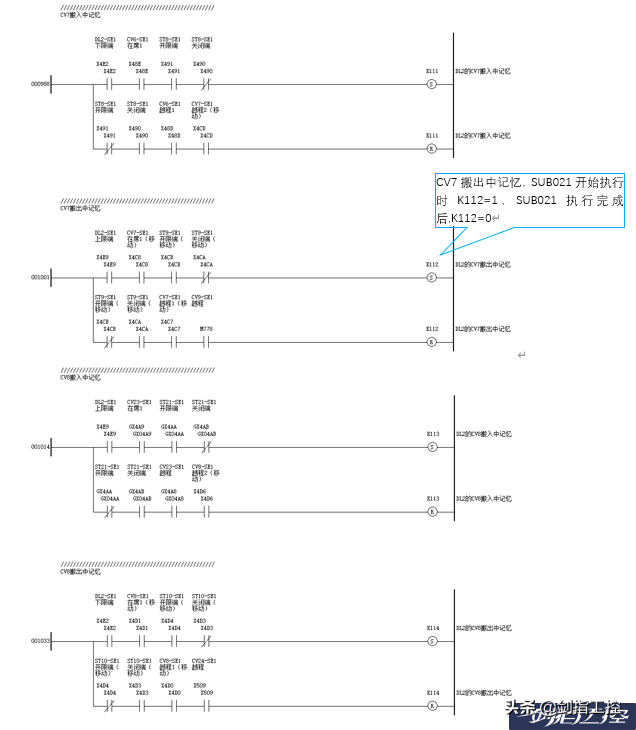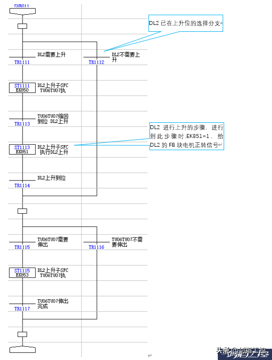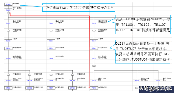 K型数据地址是断电保持型,SUB021(CV7搬出子SFC)开始执行时K112(CV7搬出中记忆)置位=1;除人为复位外,只有SUB021执行完成后K112才会复位=0;通过K112的记忆,去构造相关条件,就可以实现恢复自动运转后,DL2的SFC程序要恢复到SUB021这个步骤的相关转换条件可以满足。 方式2是在要相关的动作步骤增加判断,如已经完成这个动作就可以跳转到下个步骤。以DL2上升子SFC(SUB011)为例,如下图: