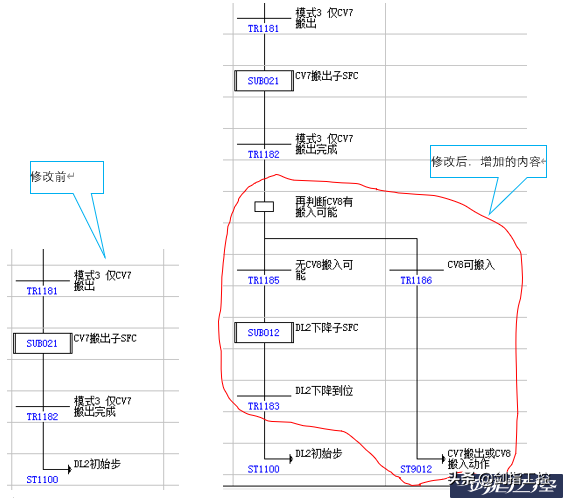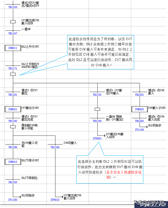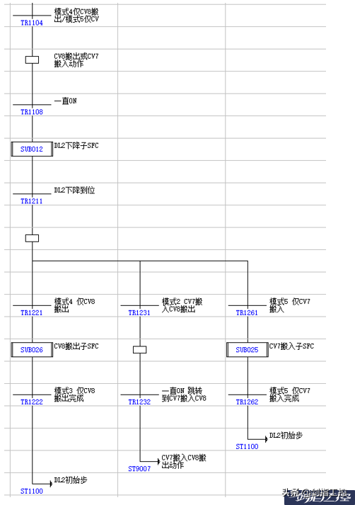 SFC程序注重流程可视化,配合丰田工机的触摸屏,可以快速监视SFC程序的当前状态,并且可以通过点击切换到转换条件内部程序,快速确认设备故障、不动作原因;SFC程序框架并不复杂,首先要清晰的分析出设备的动作流程。根据主要动作来确定动作模式,根据不同动作模式的步骤确定重复步骤,进行打包成子SFC,在不同动作模式下调用子SFC。以模块式思路来搭建SFC程序框架后,进行SFC程序修改、优化是比较简单的。例如动作模式3 仅CV7搬出完成后(TR1182转换条件满足),原SFC程序是转移到初始步,如此时没有动作需求,DL2升降机是停在二楼平台。在该工况下DL2升降机左右2侧都是空席,业主的需求是希望此时DL2应该下降到地面等待CV7搬入,这样对座椅上件的节拍有利。增加DL2下降动作很简单,在TR1182转换条件下一步进入SUB012(DL2下降子SFC),下降到位后再转移到初始步。按照这个想法来修改忽略了一个情况,如果CV7搬出完成后,CV7搬入条件还未满足,而CV8具备搬入可条件,此时DL2是没必要执行下降动作,再上升到二楼平台执行CV8搬入。应该在TR1182后增加一个虚拟步来判断应该是直接下降到位,还是直接进行CV8搬入动作。其SFC的修改增加1个虚拟步,增加3个转换条件和1个转移目标。在LD程序中就是增加3行转换条件的程序内容。