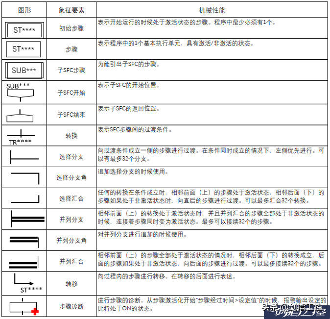 SFC(Sequencial Function Chart)是通过使用多种图表对象,对生产过程中一系列工程简单地表现出来,类似流程图。历来LD、ST等编程方式不容易分析和判断“设备的各个部件的动作进展状况”,流程图是一种使动作进度成为可视化的工具。但传统的SFC编程思路和架构一般不考虑:自动运转中出现故障重启的处理方式、在主SFC进程中调用子SFC(类似功能块,数量允许的情况下在主SFC进程中随处可以调用同一子SFC)、稍微复杂的SFC程序里如何考虑步骤的重复转移(类似跳转功能)。本文以TOYOPUC(丰田工机)的PC10G系列PLC的实际案例介绍下如何考虑这三个方向。TOYOPUC主要的SFC用语如下图: