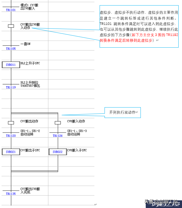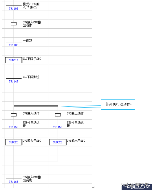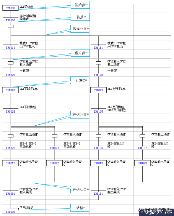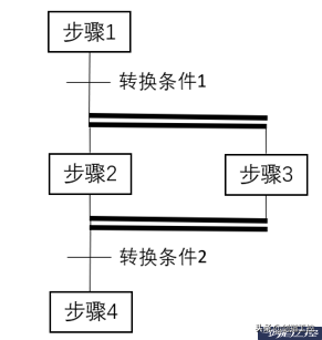 重点我们说下:子SFC(子过程)、并列、激活状态/非激活状态。 一台设备有多个机械部件组成,例如汽车生产线上的升降机有:升降电机(简称DL)(有上升、下降动作)、输送的滚筒线(简称CV)、阻挡器机构((简称ST)、升降机的定位锁气缸(简称TU)。在一个SFC流程内,不同分支执行中会有相同的动作。例如DL上升动作,在分支1执行过程中有DL先上升到位(命名为“步11”)后执行CV运转等,在分支3执行过程中也有DL先上升到位(命名为“步21”)后执行CV运转等;把DL上升动作做成一个子SFC,子SFC在同一个过程中是可以重复使用的,在不同分支执行顺序中都可以执行 “DL上升子SFC”,这样用一个“DL上升子SFC”就可以代替原来的“步11”、“步21”、、、。熟练把某些动作流程打包成一个子SFC,可以使SFC整体程序更加简洁。并列有并列分支和并列汇合,平行分支线是用2根横线来表示。如下图,并列分支前的步骤1激活时,如果转换条件1成立,则向步骤2和步骤3同时过渡(即步骤2和步骤3同时进行处理)。需要注意的是并列汇合时,如果步骤2激活,步骤3没有激活,即使转换条件2成立也不会向步骤4过渡。并列汇合要求上一步骤要全部激活时,并列汇合的转换条件成立,才能向下一步骤过渡。在实际调试中发现转换条件已成立了,SFC不能继续往下执行,可能需要关注这个问题点。