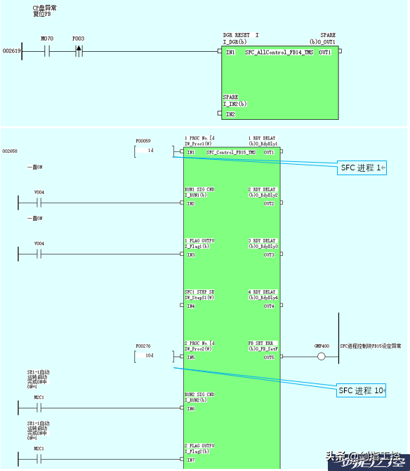 FB15是用于控制哪个SFC进程可以运行。如下图,PLC运行时,SFC进程1是一直在运行。当M2C1=1时,SFC进程10才能运行,而进程10不运行时FB也会将对应的SFC输出领域全部清零。