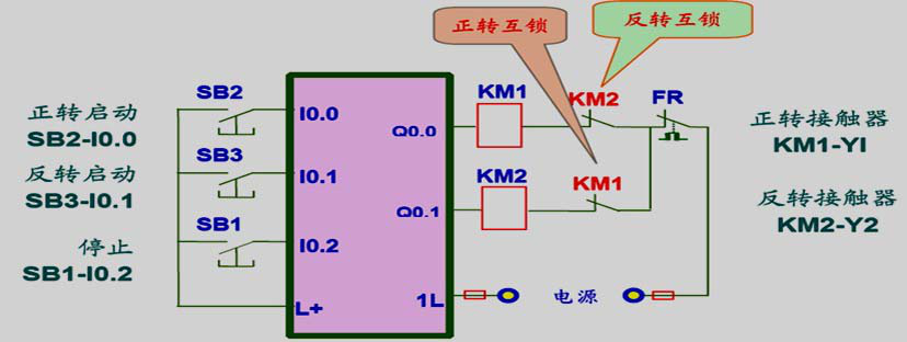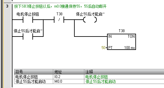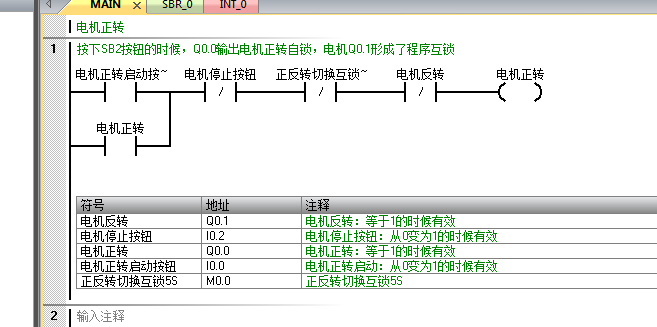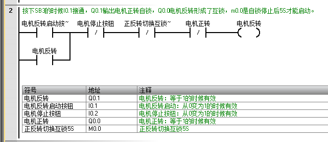 4:如下图按下SB2的时候I0.0接通,Q0.0输出电机正转自锁,Q0.1电机反转形成了互锁,m0.0是自锁停止后5S才能启动。
