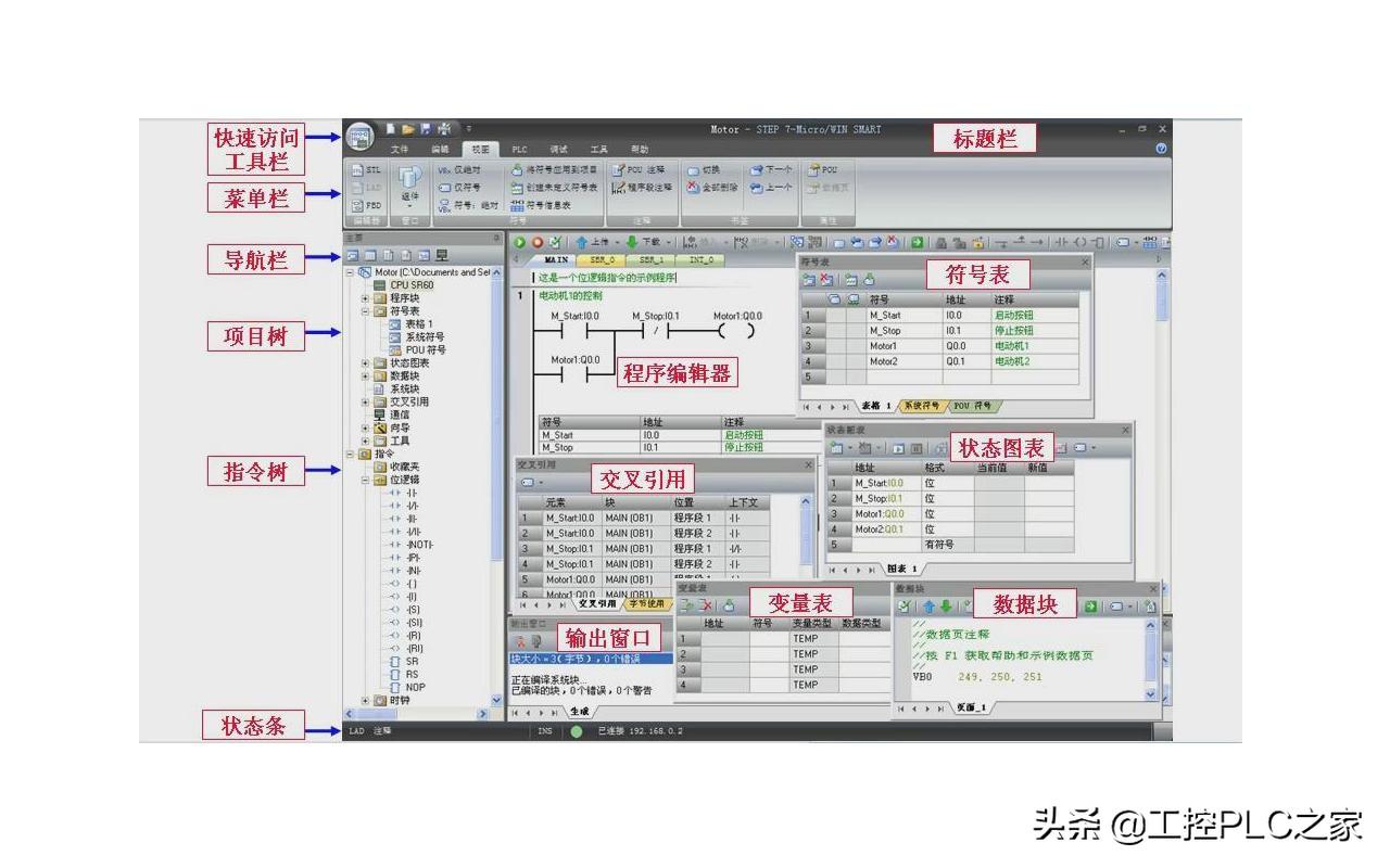 STEP7-Micro/WIN SMART含有多个窗口区域和元素。标题栏显示当前打开的项目和软件名称;快速访问工具栏可以用来简单快速的访问常用菜单命令;菜单栏采用新颖的带状式菜单设计,所有菜单选项一览无余,形象的图标显示使操作更加方便快捷;通过项目树可以对整个项目的所有元素进行编辑和组织;导航栏可以用来快速访问项目组件;指令树可以用来方便快捷的创建程序。