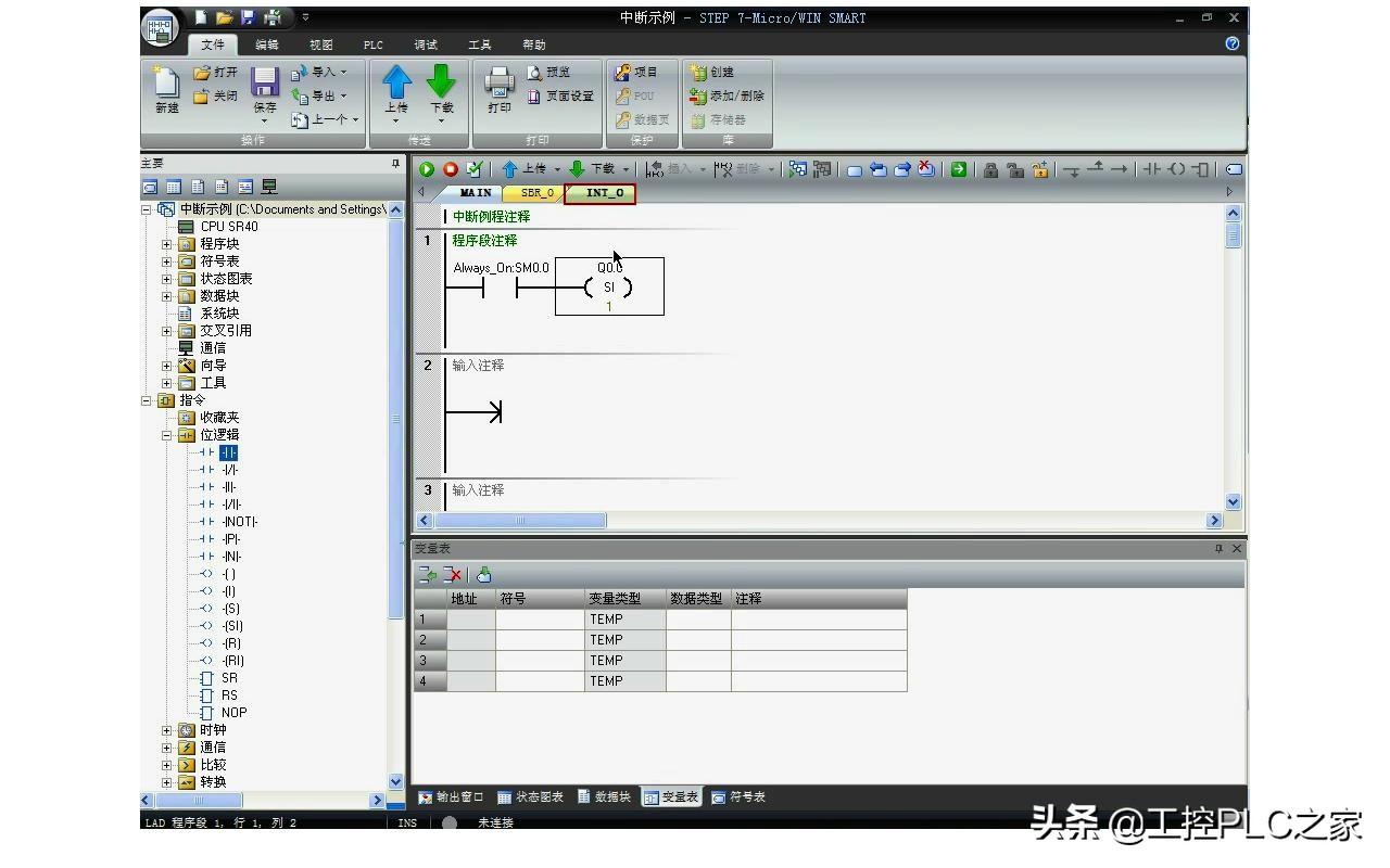 上篇文章中我们介绍了西门子S7-200 SMART的中断及中断指令,本篇我们通过一个简单的例子来学习中断指令的使用,并练习编写中断程序,在I0.0的上升沿通过中断使Q0.0立即置位,在I0.1的下降沿通过中断使Q0.0立即复位。我们来编写程序,启动STEP7-Micro/WIN SMART创建一个新项目,创建新项目后首先编写处理I0.0上升沿事件的中断程序,在指令树的位逻辑中拖放一个常开触点到中断程序INT_0,输入地址SM0.0,再拖放一个立即置位指令,输入地址Q0.0,置位个数为1。
