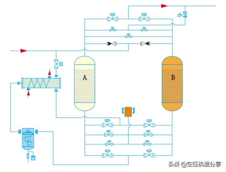 活性氧化铝脱附速度快,吸附剂再生过程短,双塔切换周期短,但是吸附能力不及分子筛,所以要求压力露点温度为-40℃时,吸附塔可以只填充活性氧化铝作为吸附剂,当需要压力露点达到-70℃时,必须填充一定数量的分子筛。