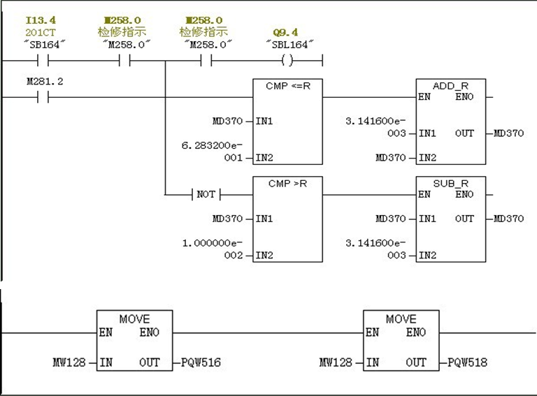 在程序控制中通过不断修正MD370的值按照0-π/2的取值范围,再将MD370(自定义)的值赋给MW128配合模拟量输出在OB1模块里的PQW516(自定义)和PQW518(自定义),去控制2WRC(双电磁铁)的输入电流,根据反馈位移值,不断调整放大器的斜坡和差动偏流,近似的达到如下图所示的模拟曲线。