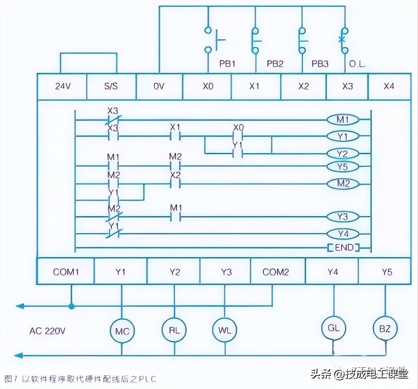 传统电工图完整转换后之PLC外部输入/输出接线与阶梯图。使用软件程序取代硬件配线后之PLC外部输入/输出接线与阶梯图,如下图7所示。