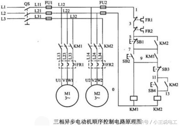 当需要电动机停止时,首先要按下电动机M2的停止按钮SB3,接触器KM2失电,5号线与7号线间接触器KM2的动合触点复位断开,在按下电动机的M1的停止按钮SB1,接触器KM1才能失电,电动机M1才能停止转动。