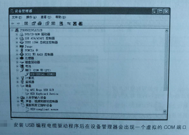 当将 FX-USB-AW电缆插到计算机USB接口时,还需要在计算机中安装这条电缆配带的驱动程序。驱动程序安装完成后,在计算机桌面上右击“我的计算机”,在弹出的菜单中选择“设备管理器”,弹出设备管理器窗口,如图所示。