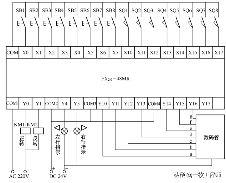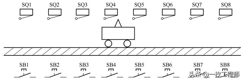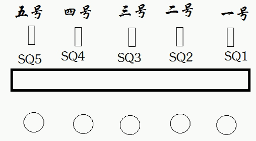 说明:一辆小车在一条线路上运行,线路上有#1-#5共计5个站点,每个站点各设一个行程开关和一个呼叫按钮。当小车每运行到一个站点,都会触碰到相应站点的行程开关,指示小车当前所处站点的位置。要求无论小车在哪个站点,当某一个站点按下按钮后,小车将自动行进到呼叫站点。