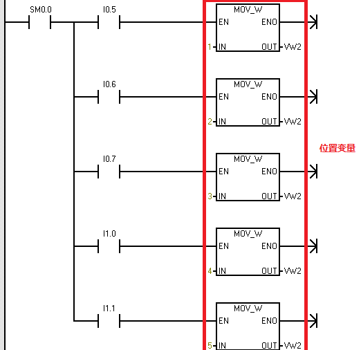 这里我们先分析一下,整个过程的运行逻辑。这个程序当中,我们需要使用“状态标志位 ”,首先,我们通过传送指令,将小车的位置信息给到位置变量VW0。