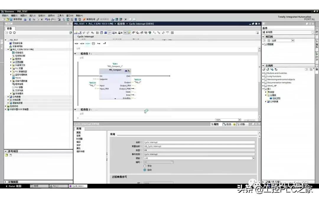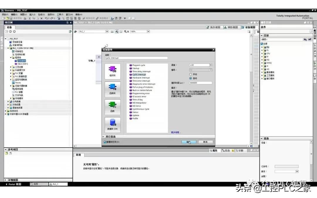 下面我们开始介绍如何实现西门子S7-1500的PID功能。为了便于演示,在程序中调用了一个过程仿真函数,由于对积分微分时间的精确计算,PID函数必须在循环中断OB中调用,为此,首先在项目中点击“添加新块”,选择“组织块”和“Cyclic Interrupt”类型,设置循环时间为500ms,代表该OB块每隔500ms被调用执行一次。