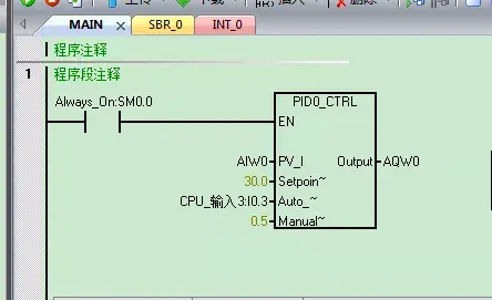 4. 此处用I0.0控制PID的手/自动方式,当I0.0为1时,为自动,经过PID运算从AQW0输出;当I0.0为0时,PID将停止计算,AQW0输出为ManualOutput(VD4)中的设定值,此时不要另外编程或直接给AQW0赋值。若在向导中没有选择PID手动功能,则此项不会出现