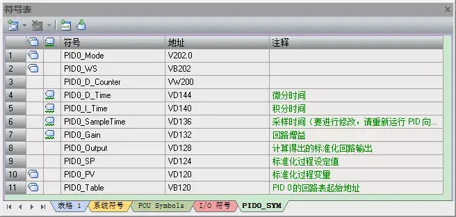 做完PID向导后可在符号表中,查看PID向导所生成的符号表(上例中为PID0_SYM),可看到各参数所用的详细地址,及数值范围。